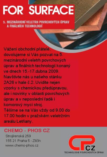 dovolujeme si Vás pozvat na 5.mezinárodní veletrh povrchových úprav a finálních technologií FOR SURFACE 2009, konaný ve dnech 15.-17.4.2009 v Praze ve veletžním areálu Letňany, denně od 9-17 hodin. U našeho stánku 2A26 v hale 2 shlédnete nejen vzorky s chemickou přeúpravou, ale i novinky v oblasti povrchových úprav a v neposlední řadě i komorový mycí stroj.