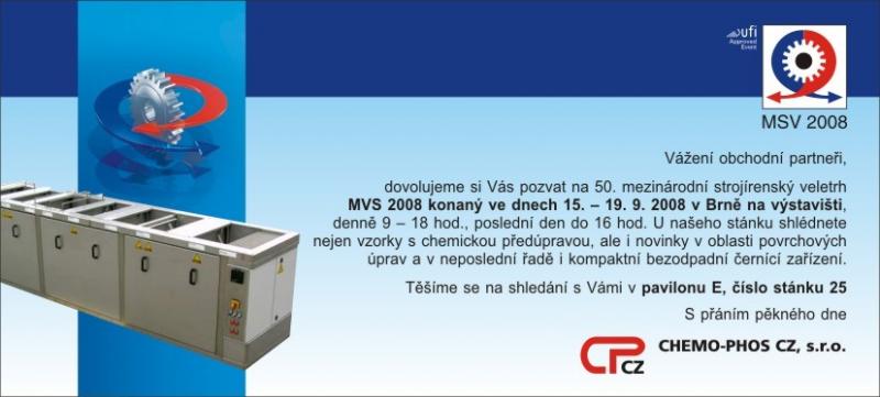 dovolujeme si Vás pozvat na 50. mezinárodní strojírenský veletrh MSV 2008 konaný ve dnech 15.-19.9.2008 v Brně na výstavišti, denně 9-18 hod., poslední den do 16 hod.